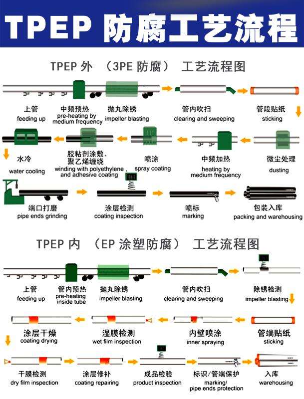 第四代大口径管道新型防腐生产线,外壁采用热熔结缠绕工艺底层环氧树脂、中间层胶黏剂、外层聚乙烯形成三层结构的防腐层,内壁采用热喷涂环氧粉末防腐方式,将粉末经高温加热熔结后均匀地涂敷在管体表面上,形成钢塑合金层,简称TPEP钢管,(T,三层英文Three的首写字母,PE指聚乙烯,EP指环氧树脂),极大提高了涂层附着力及涂层厚度,增强了耐磕碰,耐腐蚀的能力。